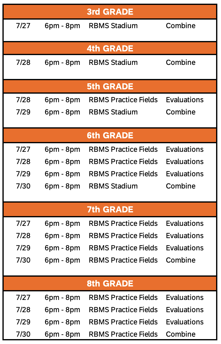 - Grade specific tackle football teams at 6th-8th Grade (no combined grade teams) with 11-players and regulation sized field.