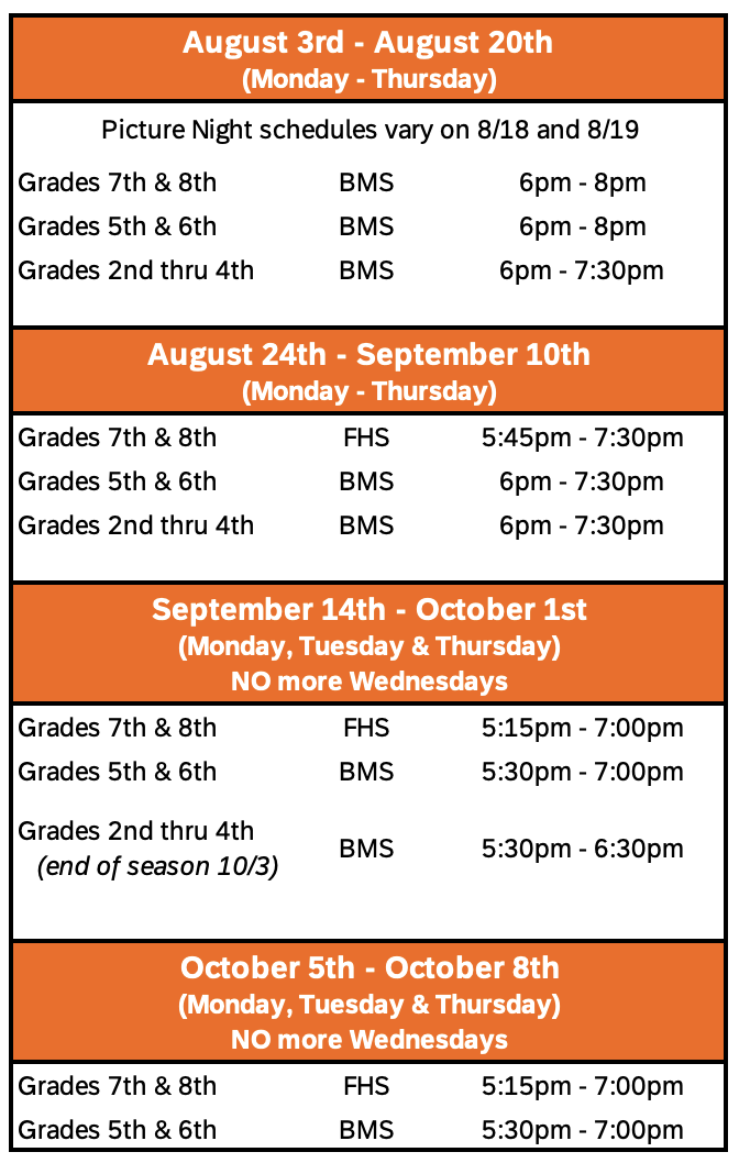 Starting August 24th, 7th and 8th graders will be practicing at FHS.