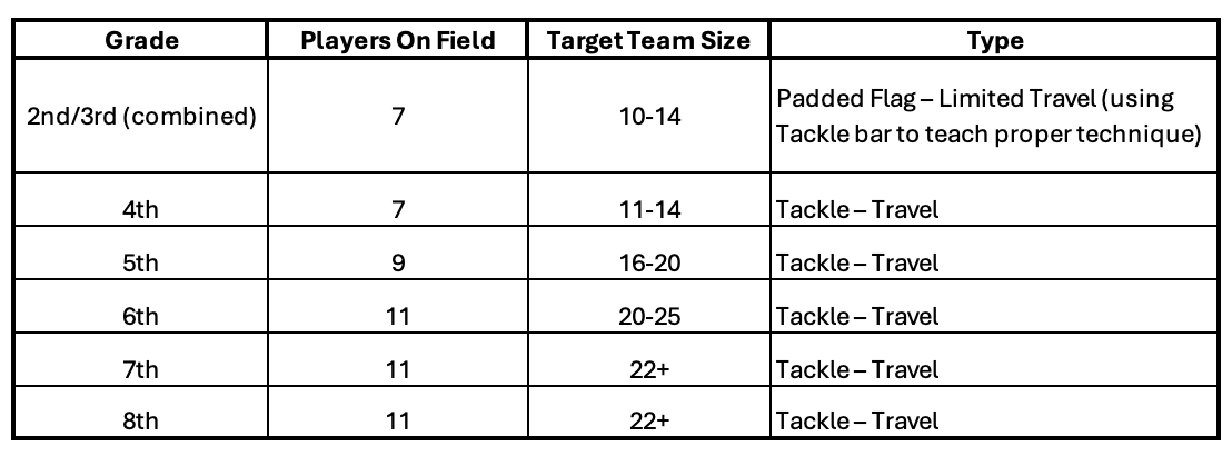 - Grade specific tackle football teams at 6th-8th Grade (no combined grade teams) with 11-players and regulation sized field.